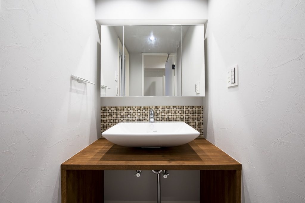 洗面台はタイル張りで仕上げ、さりげない華やぎを添えました。