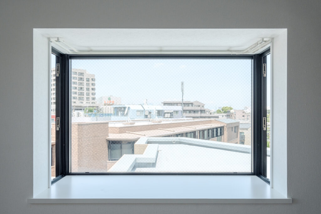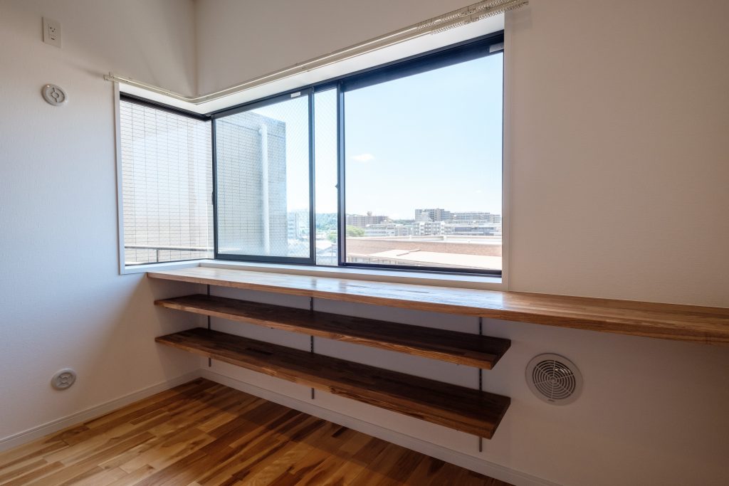 リビングの窓側には、腰の高さまでの造作棚を設置しました。
