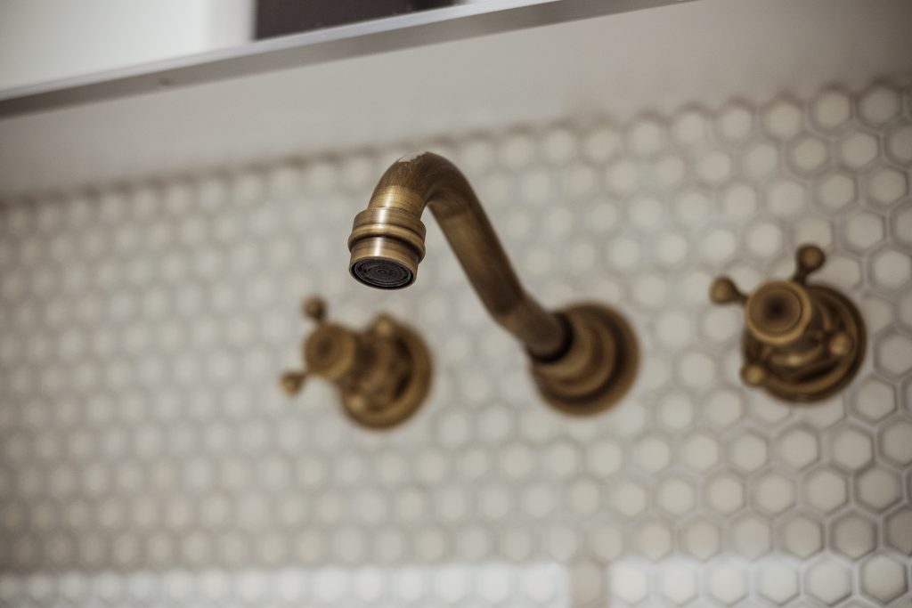 洗面台の照明や蛇口には、施主さま自身が選んだ暗めの金属部品を取り付け、レトロで重厚感のある雰囲気を演出しました。