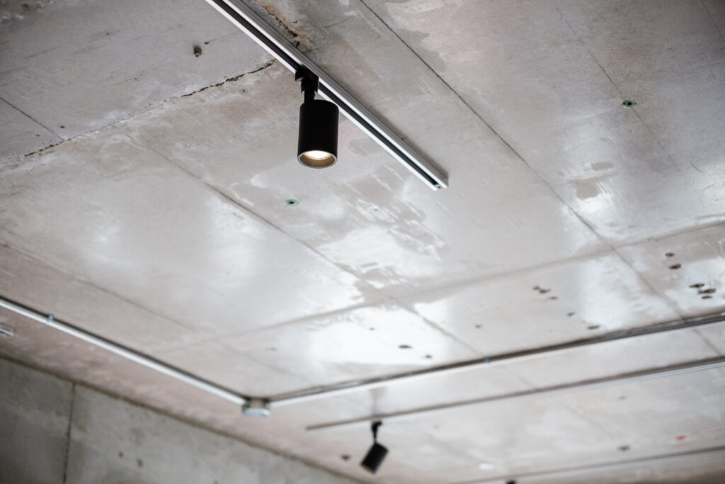 天井には、ライティングレールを用いた間接照明を配置。