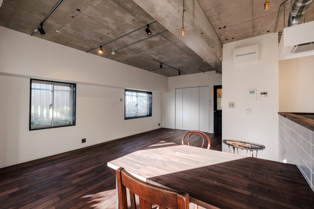 広いスペースを最大限に活かし、キッチンにはカウンターや造作テーブルを設置。