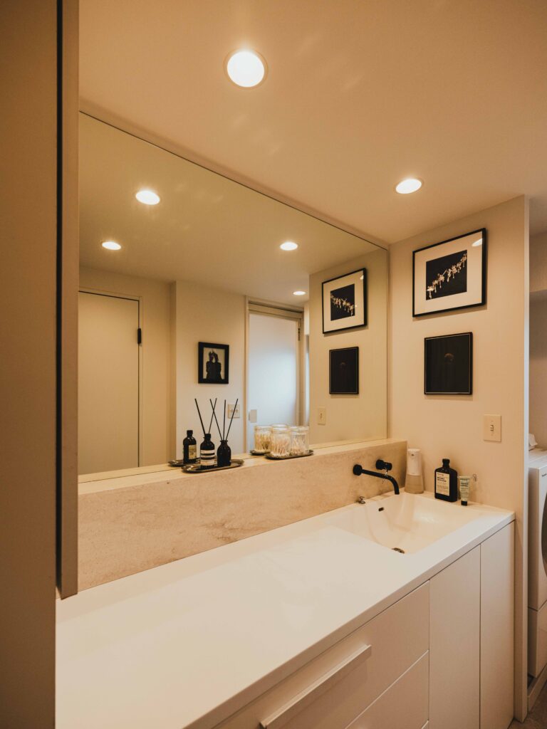 洗面台は特注サイズのオーダーメード品。使いやすさを追求した結果この仕様になりましたが、設計士との打ち合わせでもしっかりとそのご意見を頂き、設計に反映しています。