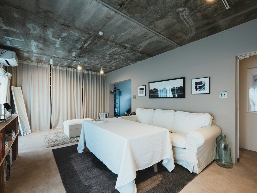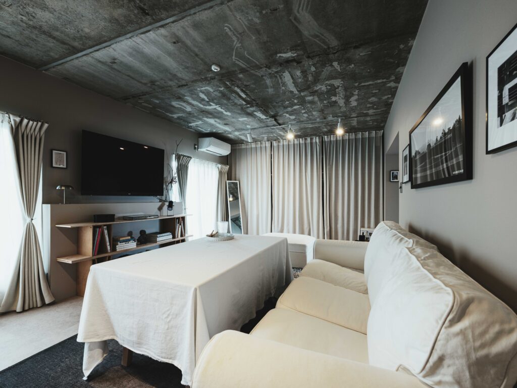 無機質のあるお部屋は好みが分かれるところですが、施主様はこのコンクリートの雰囲気を大変気に入られ、間仕切りのない広々としたメインルームを生み出すことができました。