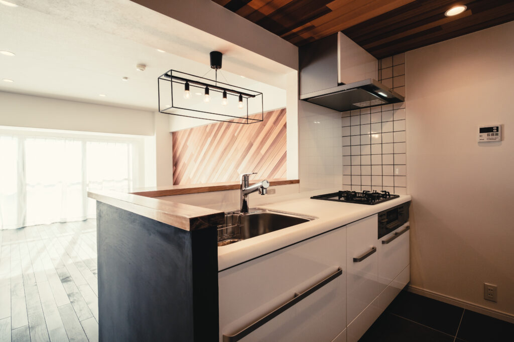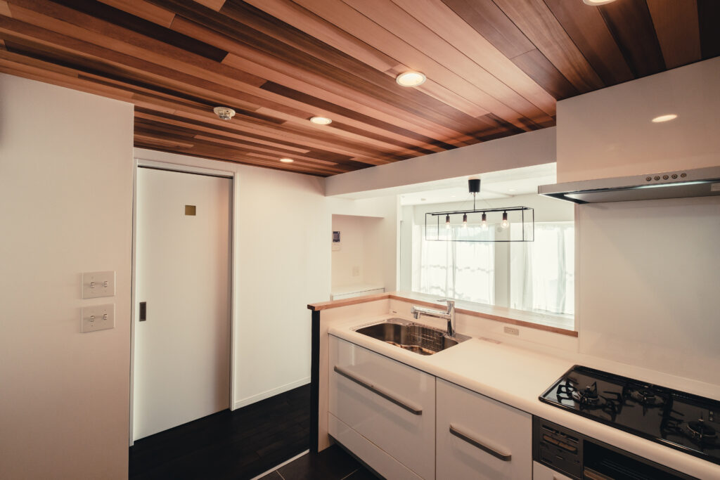 リビングで躍動する木目とは対照的に、キッチンはステンレスの床見切り材と黒目地のタイルが印象的な空間です。