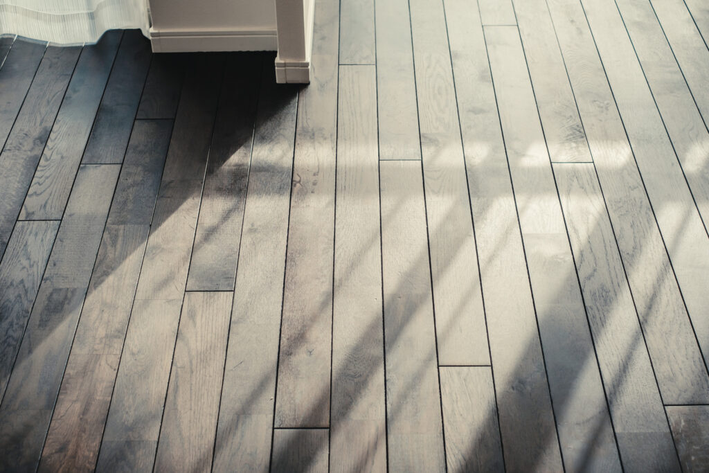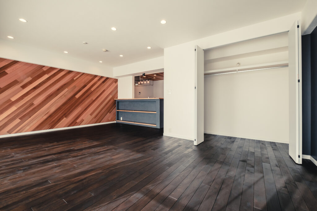 床には濃い色の無垢フローリングを採用し、木の温もりと深みを感じられる空間に。