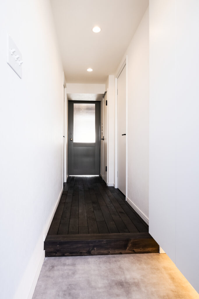 玄関へ一歩足を踏み入れるとまず出迎えるのは、左官職人の手仕事が息づくモルタル塗装。