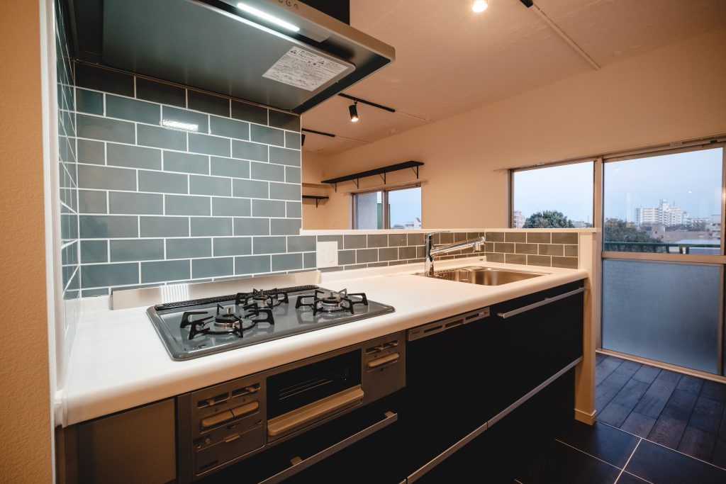 キッチンは半分を壁で仕切り、開放感とプライベート感の両方を叶えました。