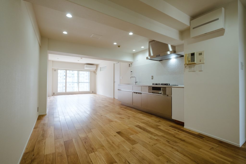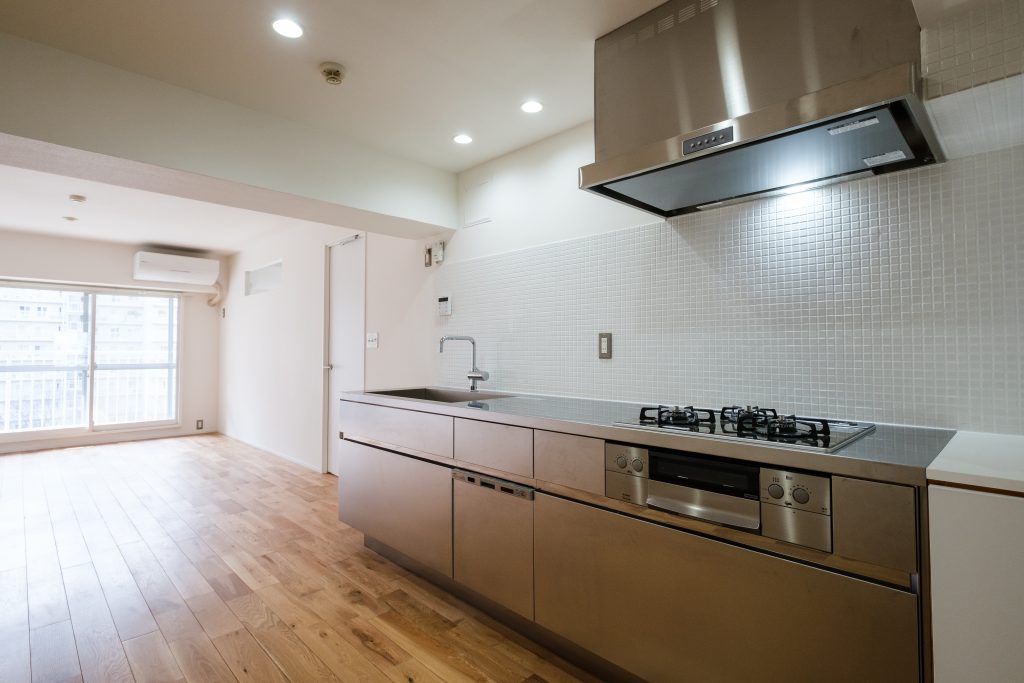 光を受けてやさしく輝くステンレスと、木のフローリング。