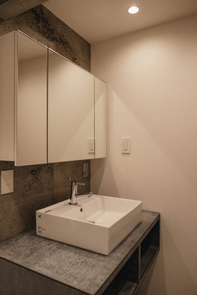 石の質感にこだわった独立洗面台には、アドヴァンコンクリエイトを採用。