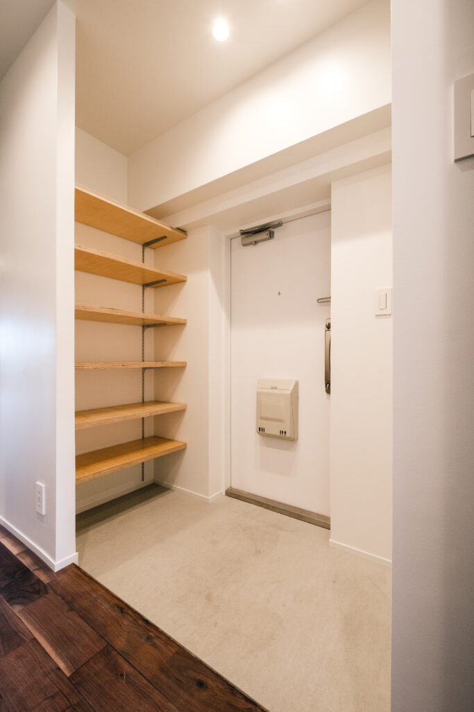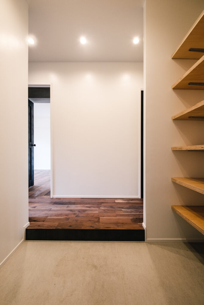 玄関横には、タモの集成材を用いた下足棚を設置。