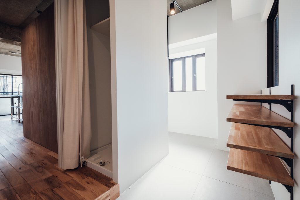 白く整えられた玄関と、無骨な素材感が広がる居住部。