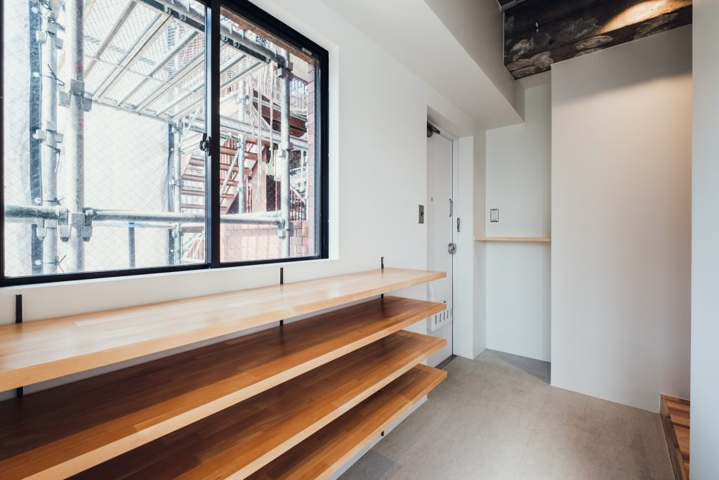 寝室をなくす代わりに、玄関まわりには造作による大型の棚板を設置。