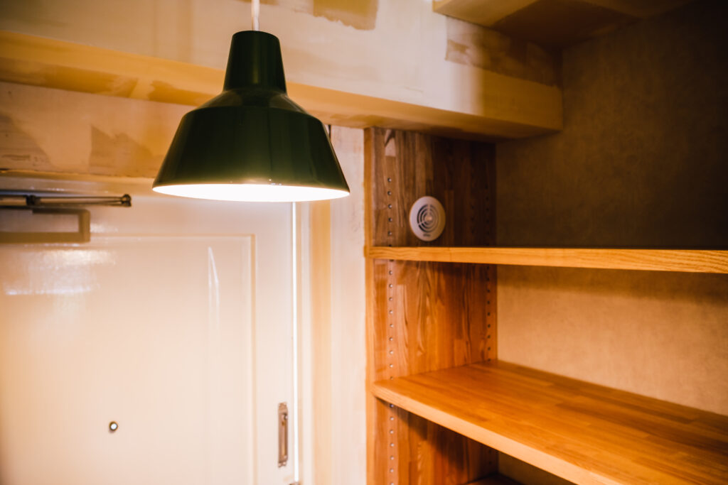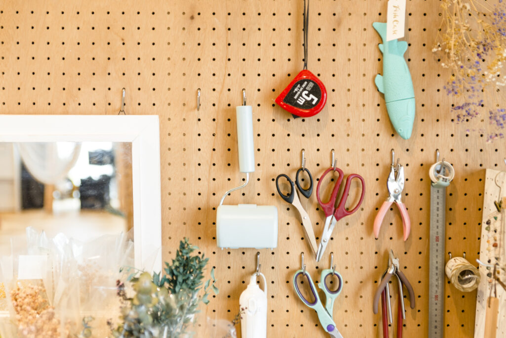 DIYで手を加えられる天井や、有孔ボードに掛けられていく小物たち。