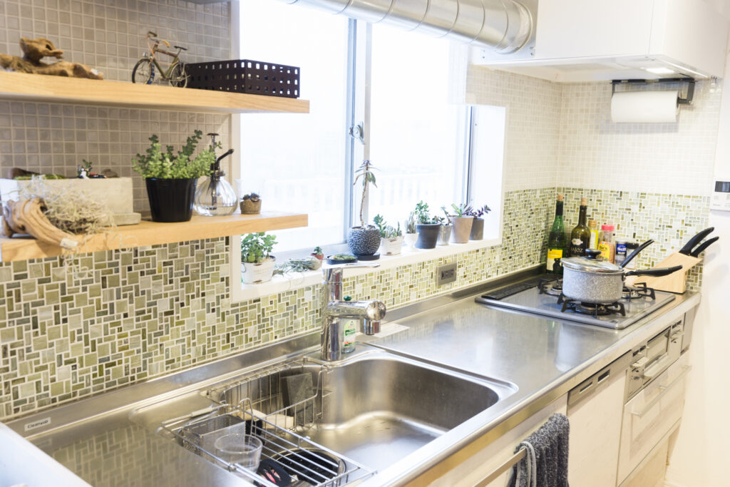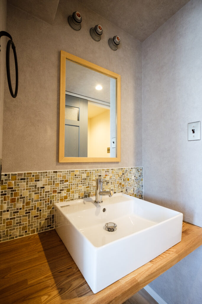 キッチンの造作棚、洗面台の木枠、アクセントタイルなど、細部にもこだわりが。