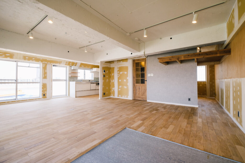 壁を取り払い、2LDKから1LDKへと変更されたリビングダイニング。