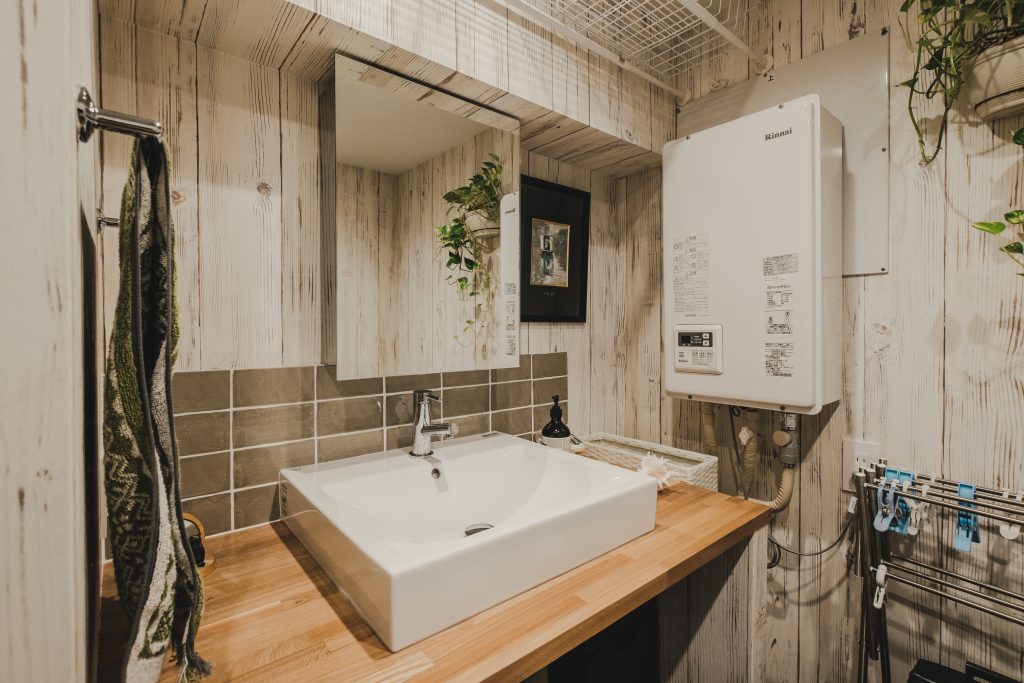 洗面所は木目と陶器を組み合わせ、レトロ感を演出。