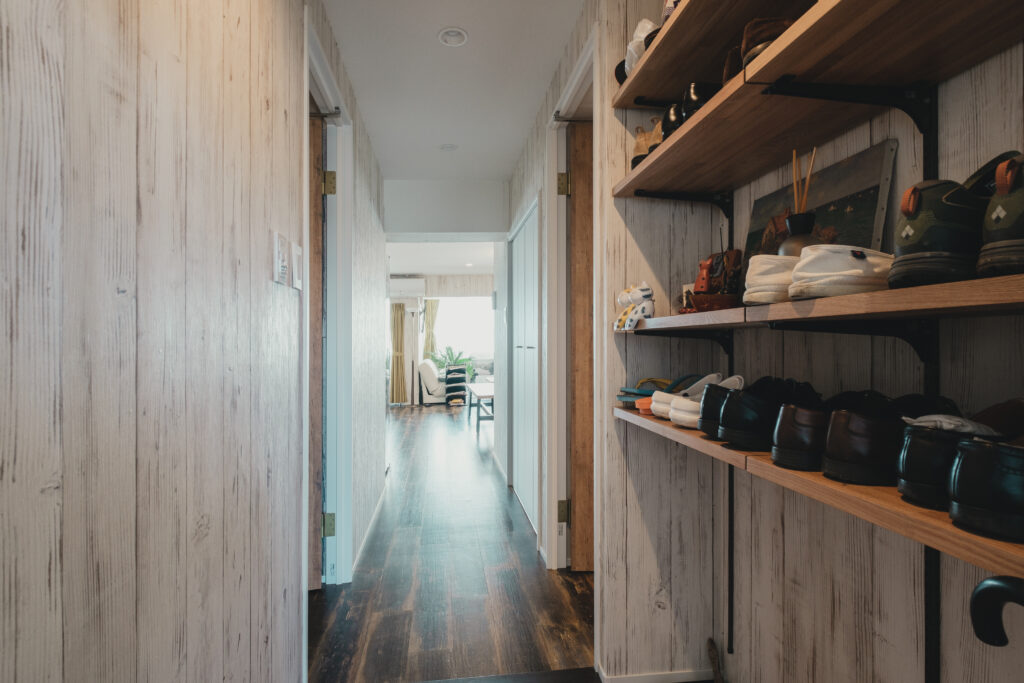 玄関には機能的なシューズラックを配置し、日常の使いやすさも妥協しません。