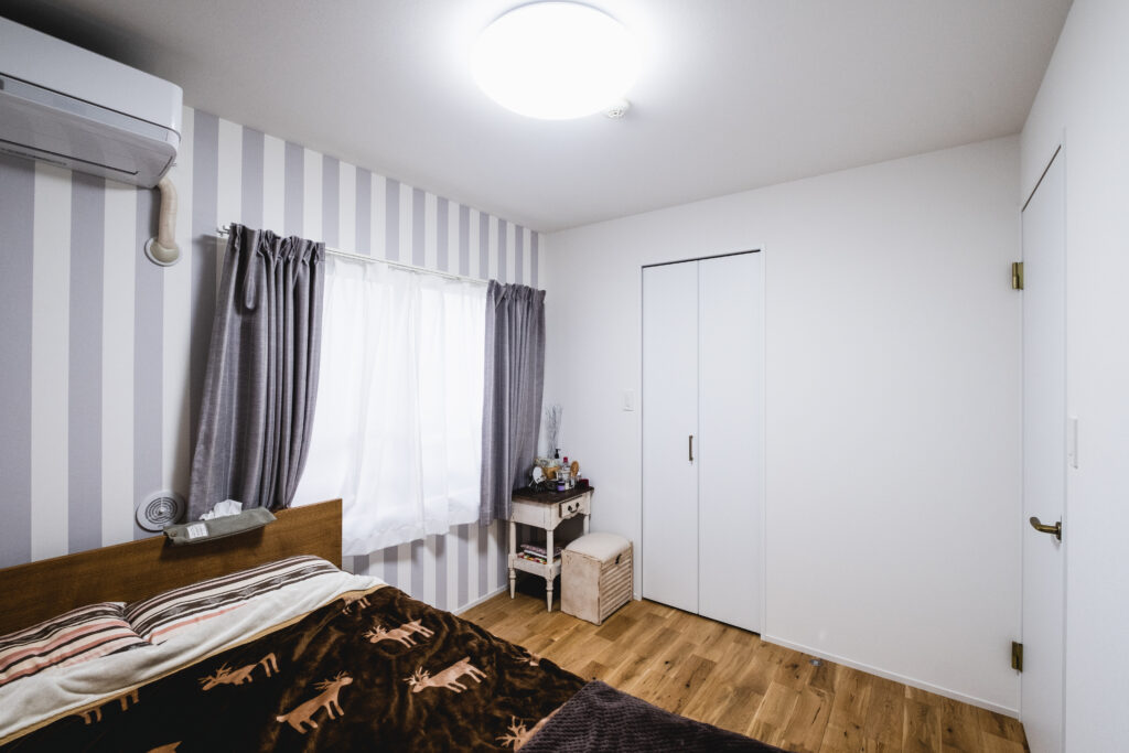 ストライプ柄の壁紙が天井を高く見せ、淡いグレーが心を落ち着かせてくれる空間です。