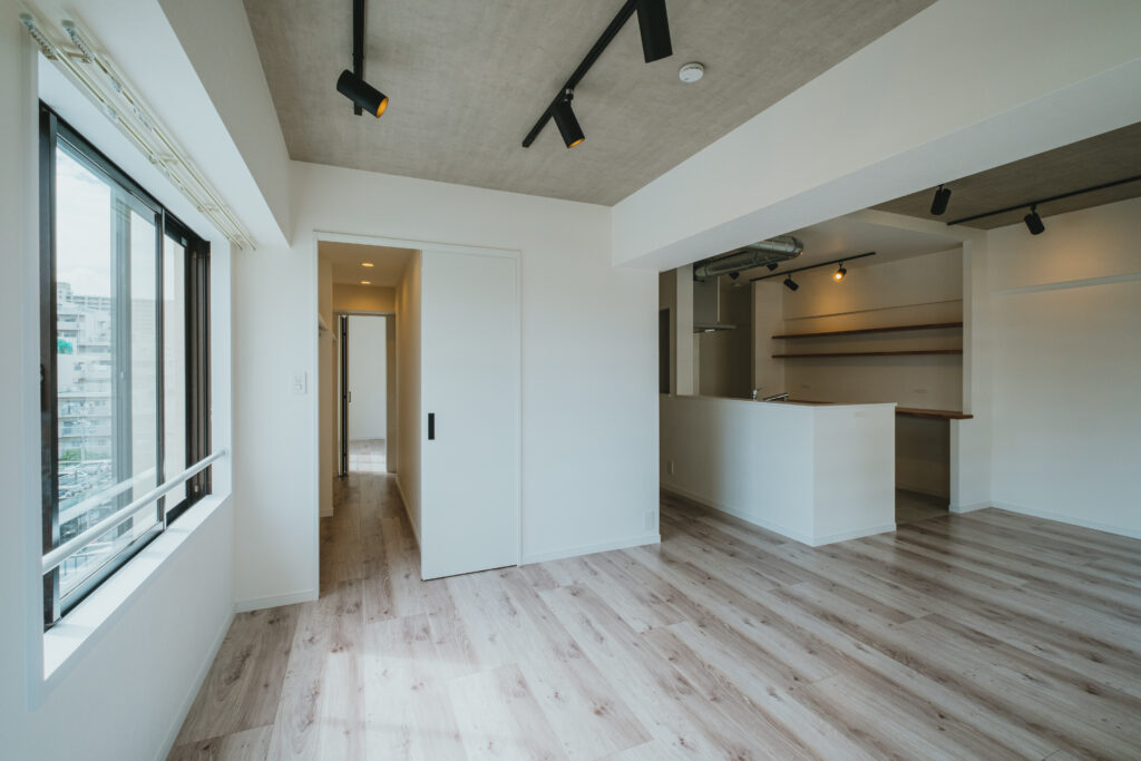 今回のリノベーションで境界を取り払い、約15畳の大きなワンルーム空間へ再設計しました。