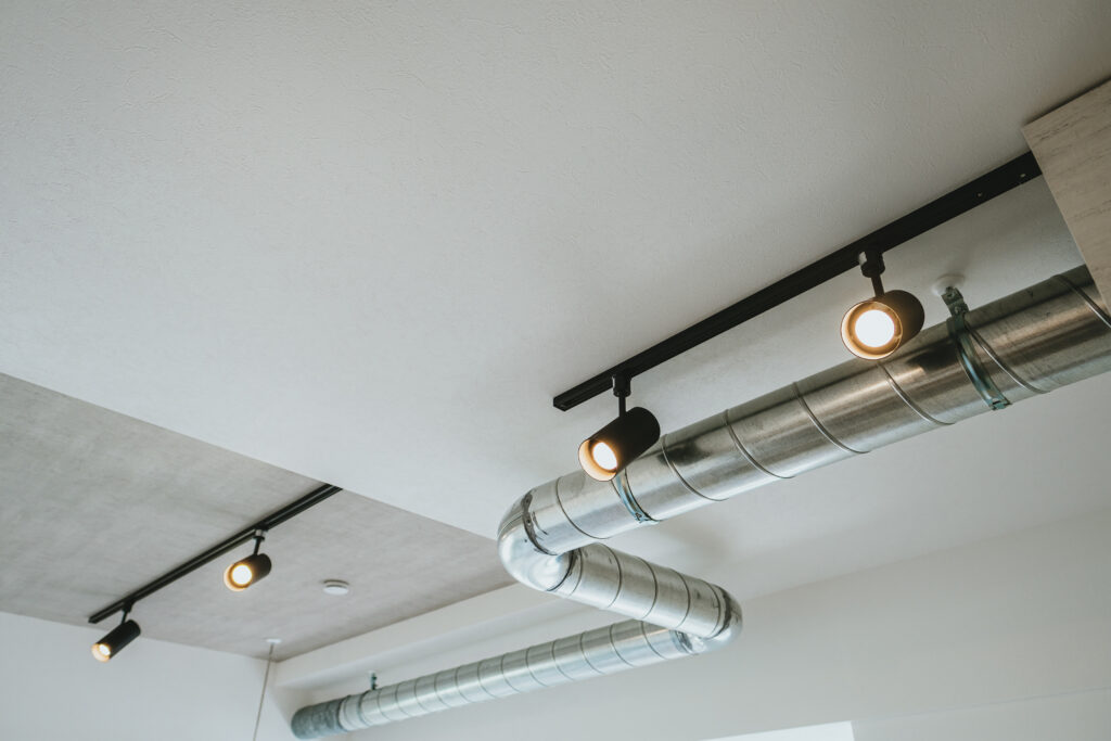 天井はあえて白を避け、淡いグレーを採用しています。