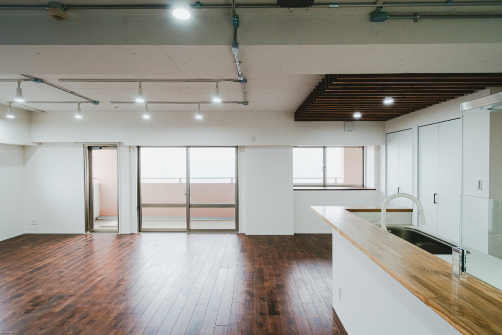 壁を取り払い、20畳を超える大きな広がりを実現したリビング・ダイニング・キッチン。