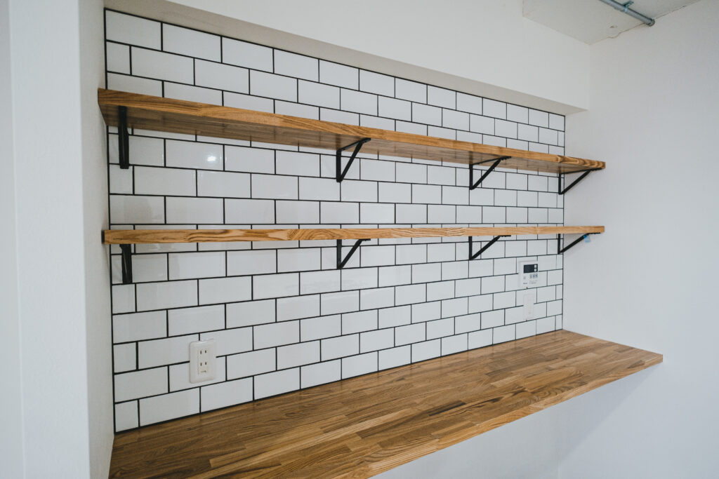 白タイルの壁と木の棚を組み合わせた、背面収納。