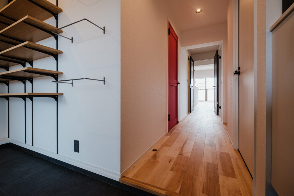 玄関横には大容量の土間スペースを設け、スキー板やサーフボードも立てかけられるパイプを設置。