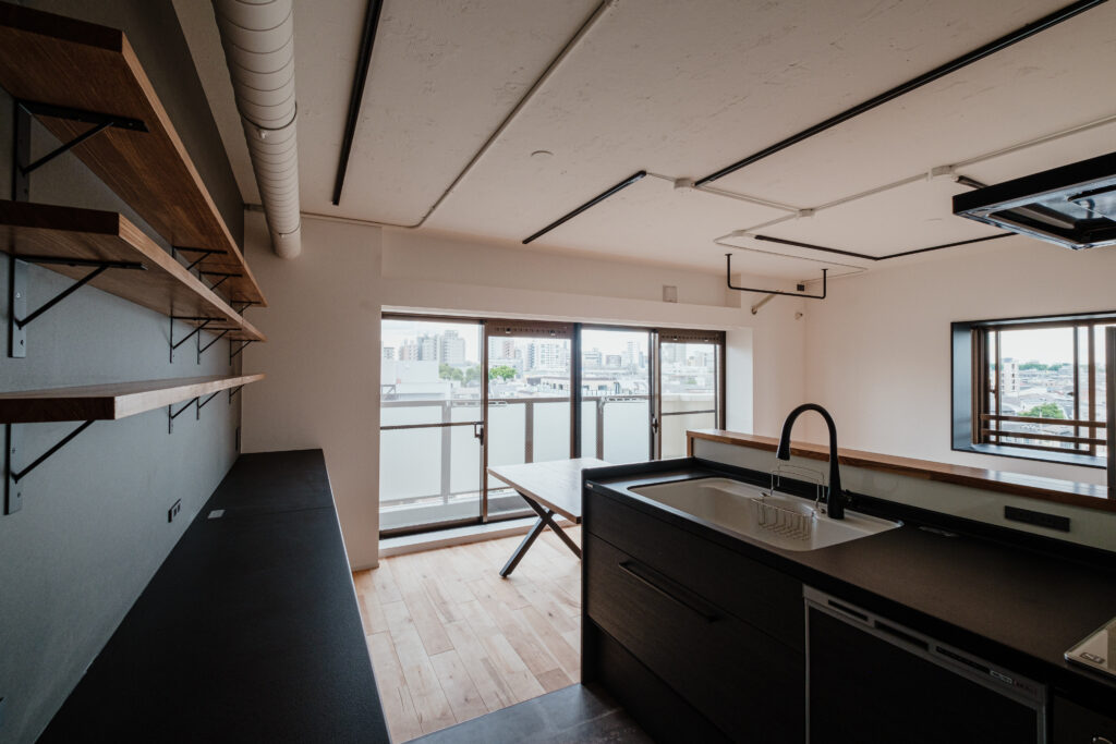 バルコニーの室内干し竿も黒を採用し、機能的なアイテムさえデザインの一部に溶け込ませました。