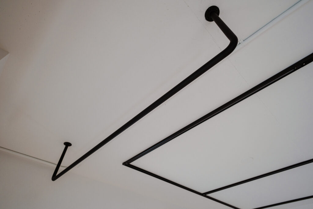 配管は天井と同じ白でカバーし、ライティングレールは黒で統一。