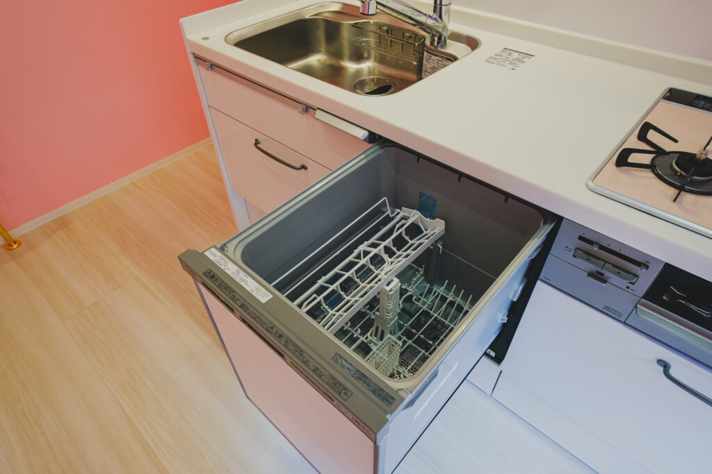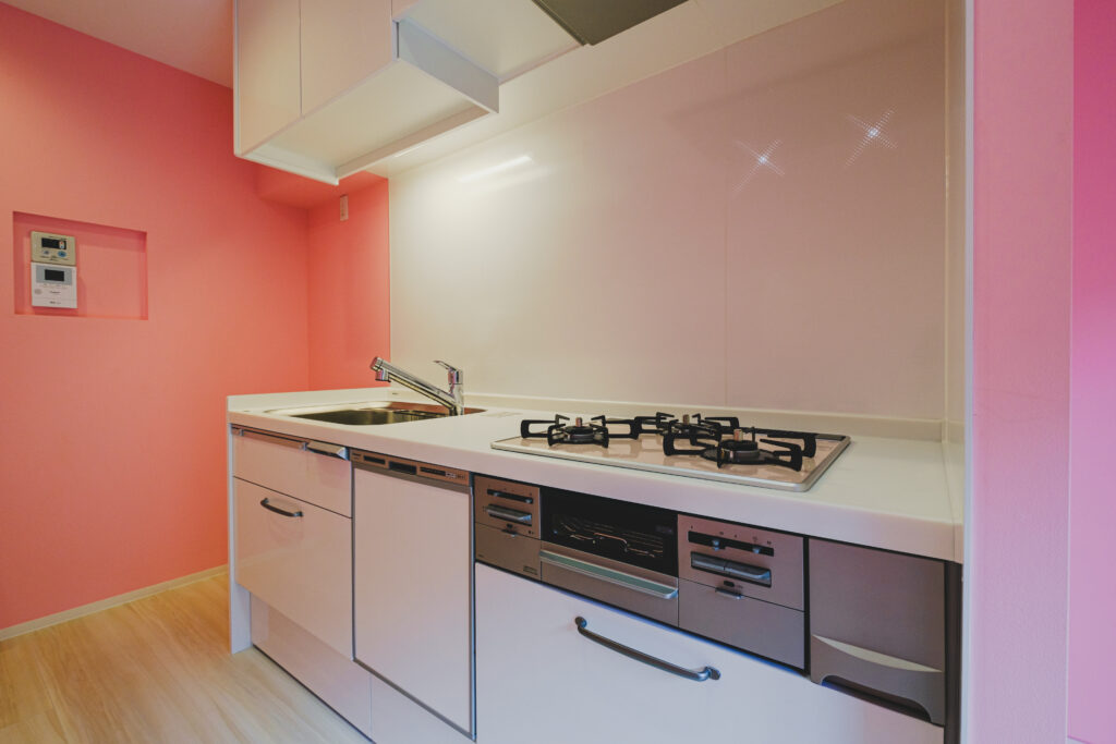この部屋の中心にあるのは、白をベースにした清潔なキッチン。