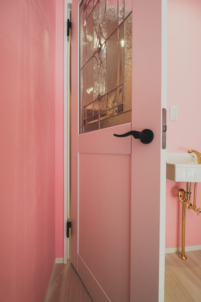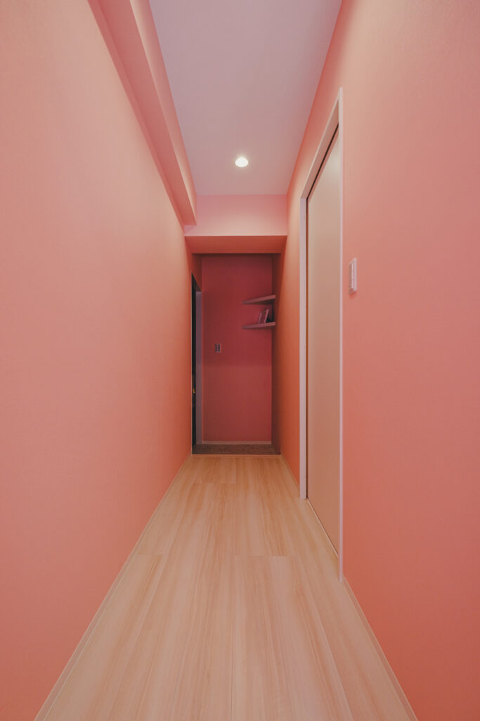 玄関のドアを開けて最初に目に飛び込んでくるのは、やわらかなピンクの壁。