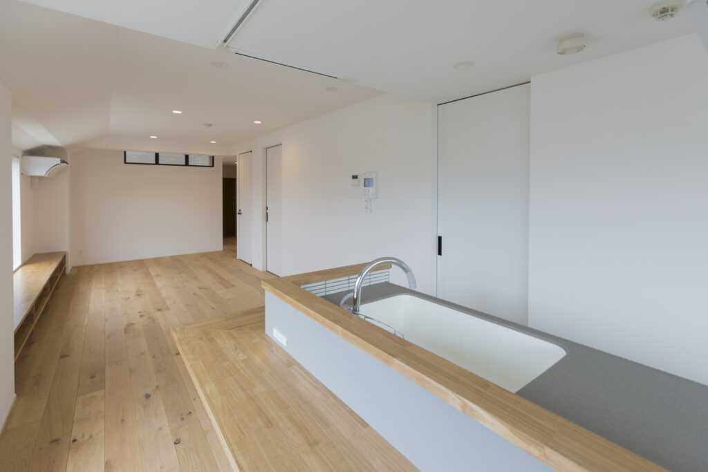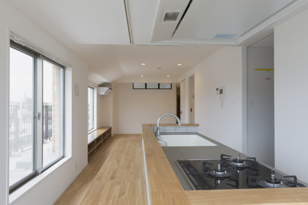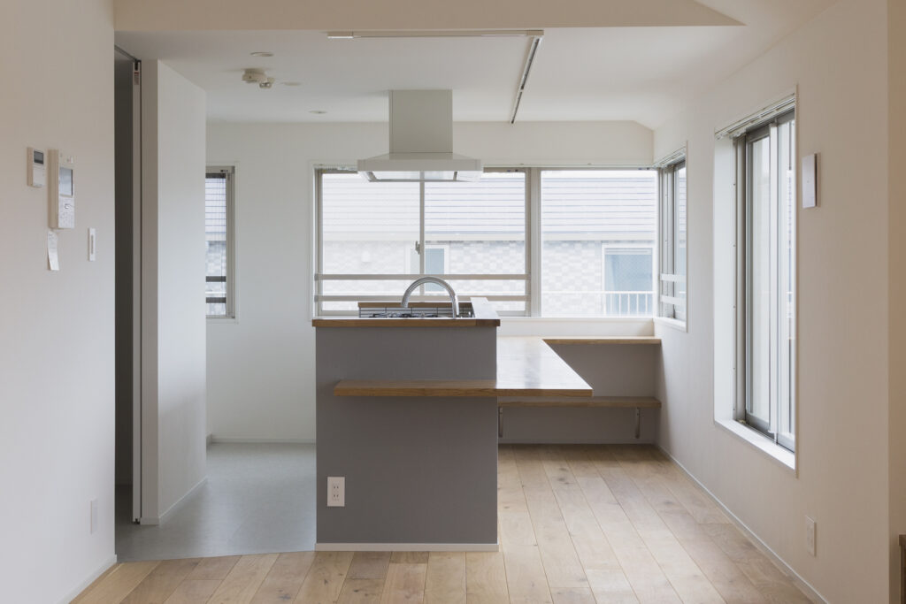 部屋の端には、アイランドキッチンを設けました。