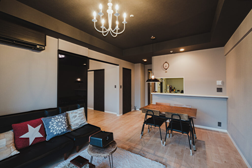 LDKの中心には、シャンデリアが黒天井に美しい光の模様を描きます。