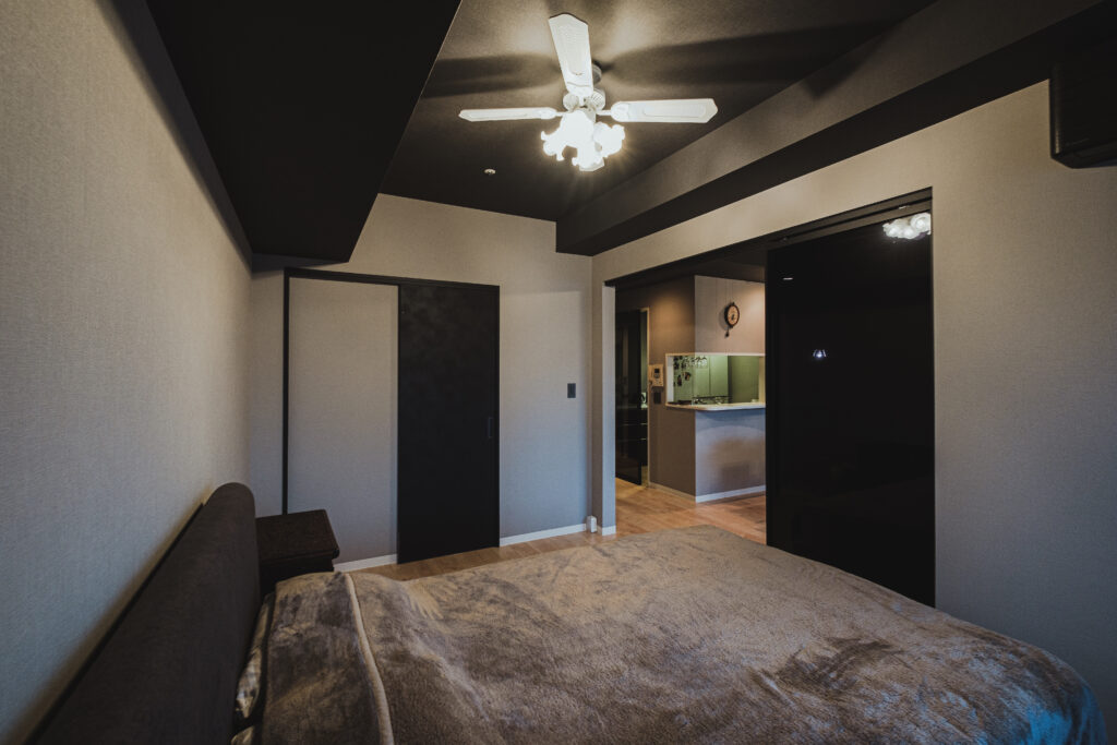 LDKに隣接する寝室は、黒枠のガラス引き戸で仕切ることに。