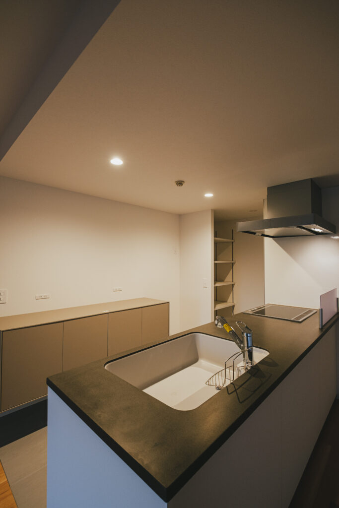 シンプルで清潔感あふれるデザインに、黒のワークトップや取手をアクセントにしています。