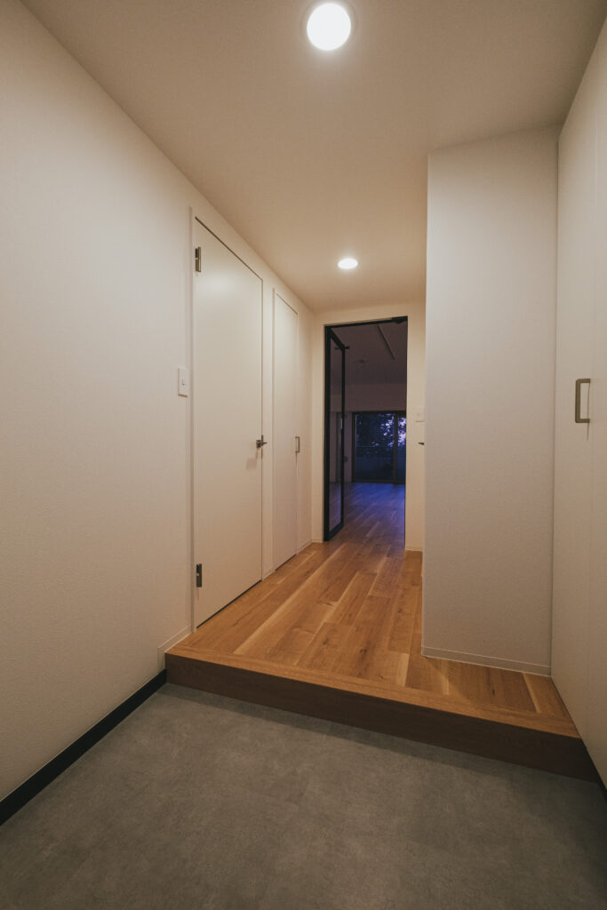 LDKから玄関ホールへと続く扉は、全面ガラスの開き戸にしました。