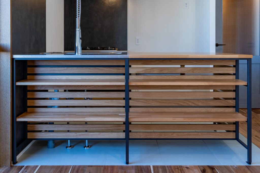 黒のアイアンと木の質感が織りなすコントラストが、この空間に確かな存在感を与えています。