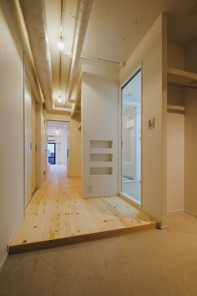 廊下には大きな収納を設け、カーテンで目隠しできる仕組みにしました。