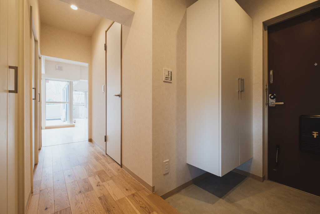 玄関には、シューズボックス、可動棚、クローゼットを完備。