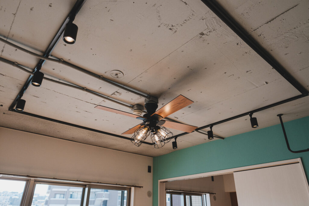 視線は上へと伸び、シーリングファンが静かに空気を巡らせます。