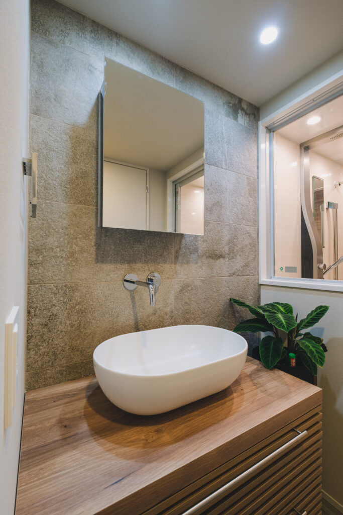 床・壁にあしらった大判タイルが織りなす上質なコーディネート。
