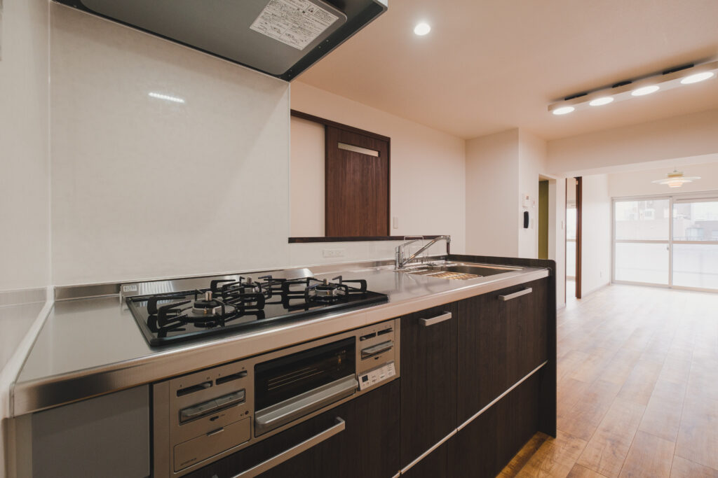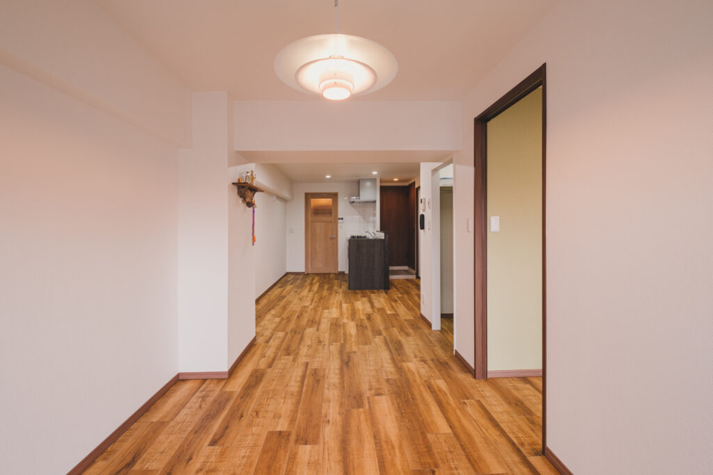 元々ベッドルームだった部屋の間仕切りを撤去し、LDKを縦長にデザイン。