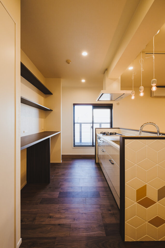 キッチンの腰壁には、ひし形のタイルを組み合わせた印象的な仕上げを採用。