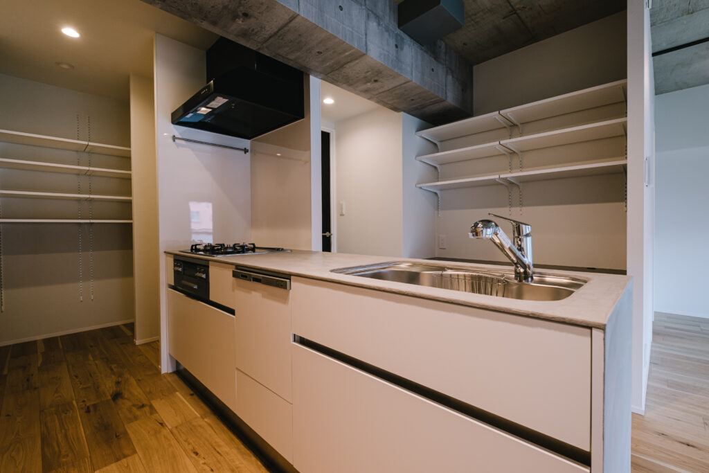 キッチン奥には、ウォークインタイプのパントリーを配置。