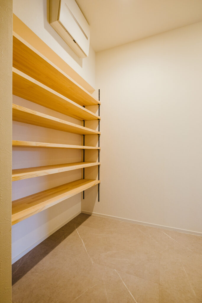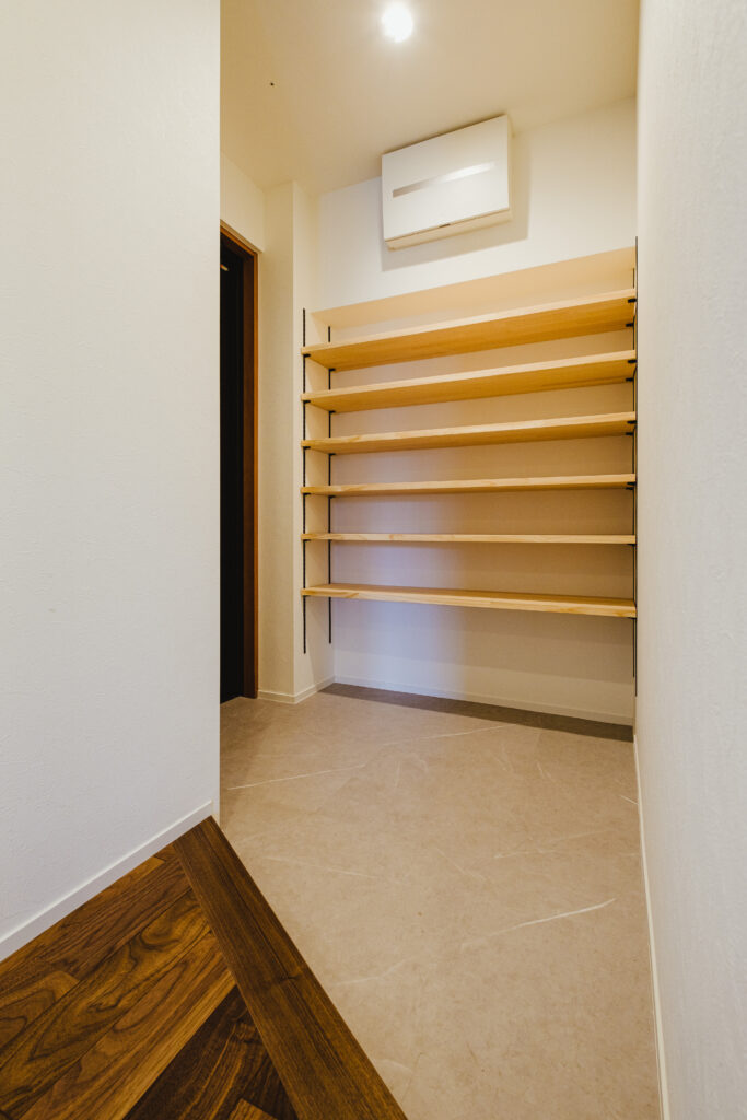 ウォークインクローゼットとユーティリティーを兼ねた一室は、家事効率を高める要となる場所です。
