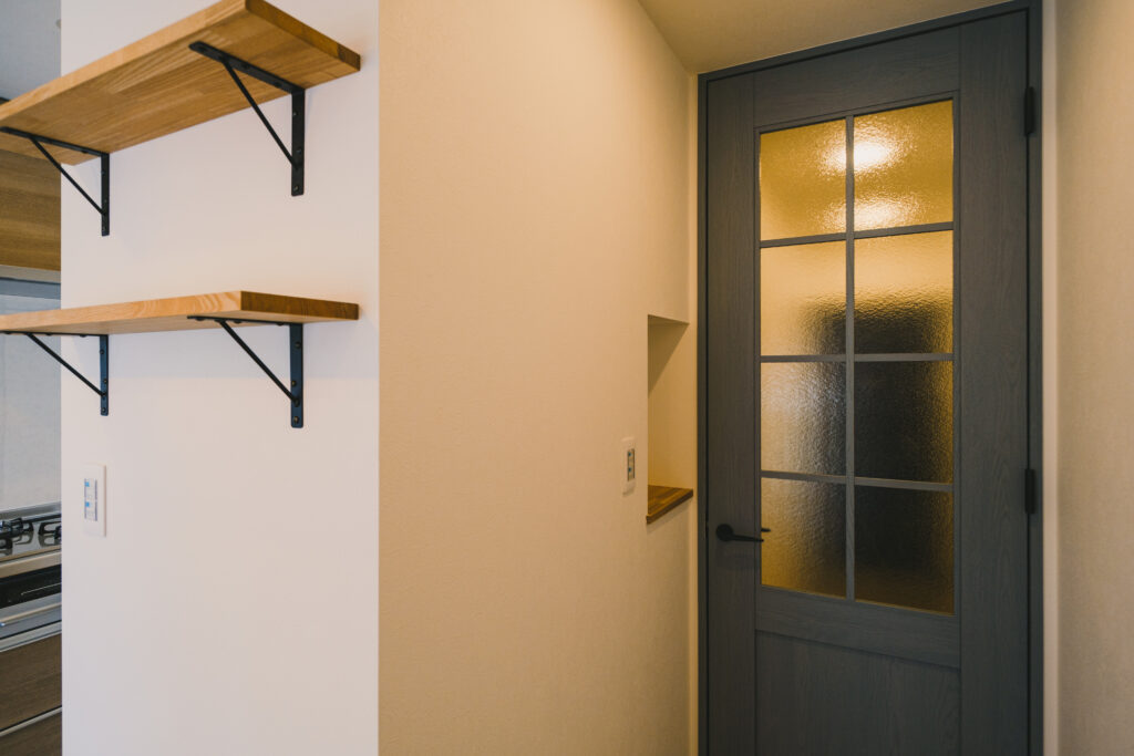 隙間を活かしたパントリーは、乾物や保存食材をまとめるのにぴったり。