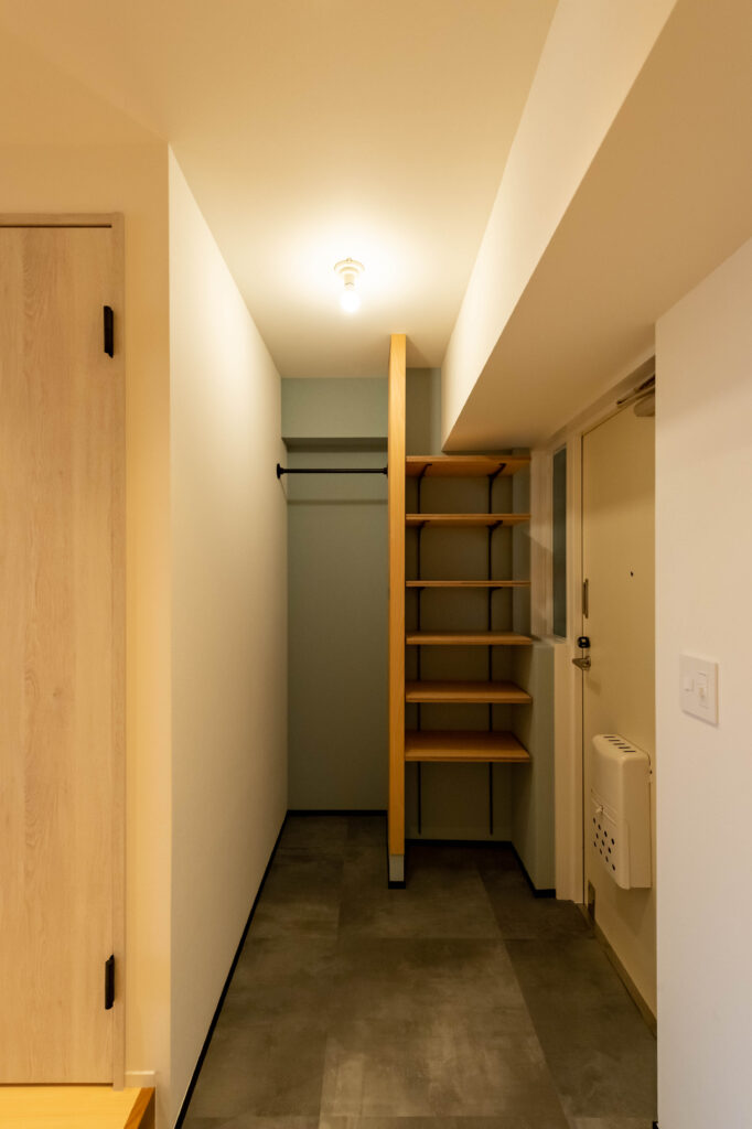 通路を圧迫せず、リビング側を広く使える合理的なレイアウトです。