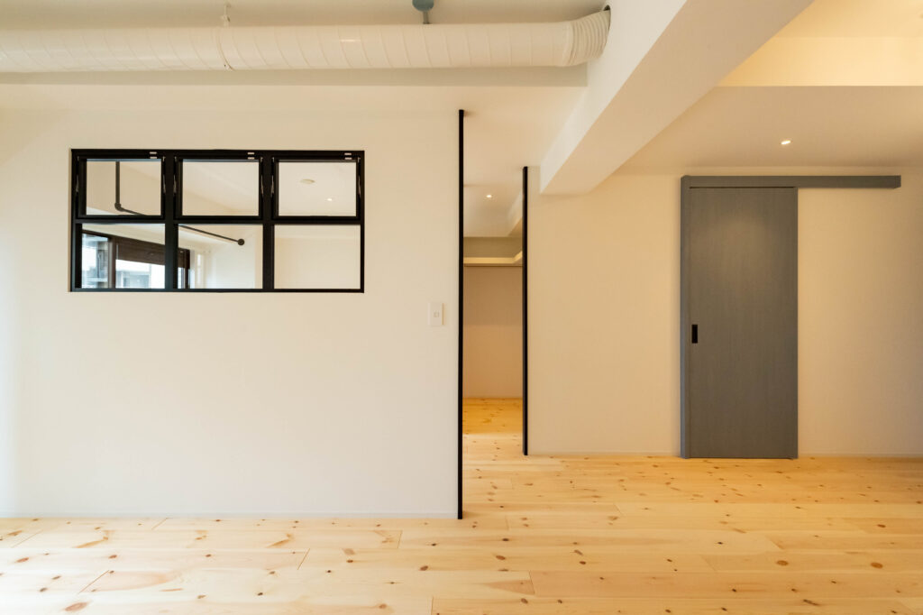 両室を隔てる壁には、黒フレームの室内窓を設置。