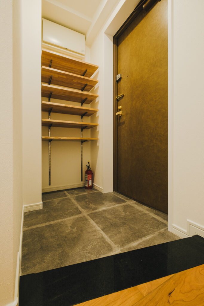 モルタル調のフロアタイルと美しくつながり、足元から洗練された印象に。