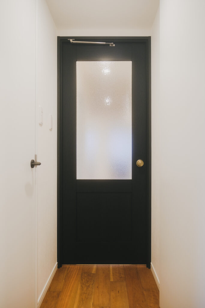 LDKと廊下をつなぐ出入り口には、デザインガラスをはめ込んだ開き戸を採用。